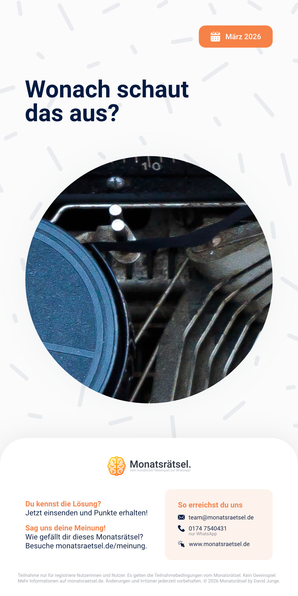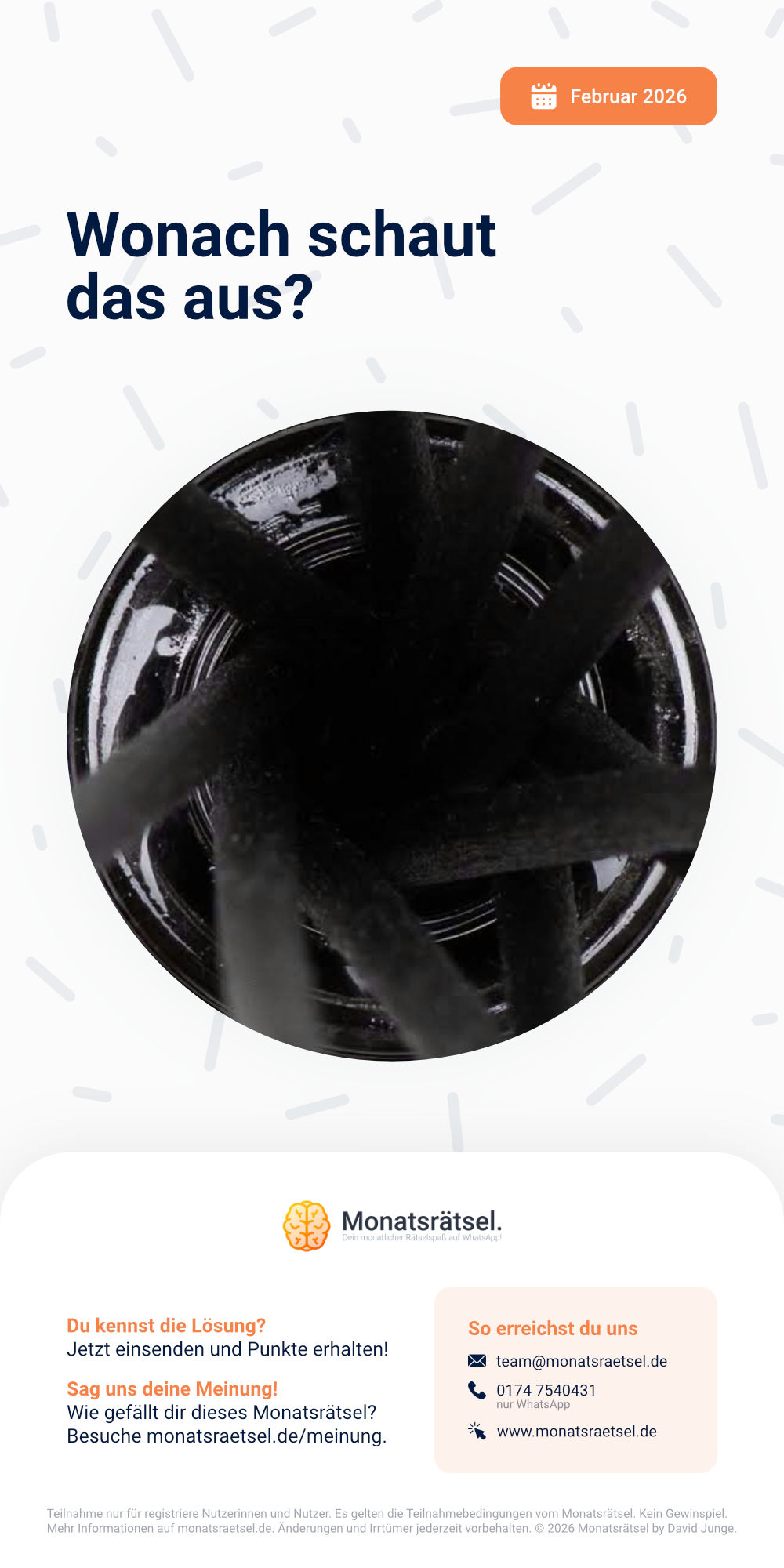 Das Monatsrätsel wird zum 30.06.2026 ersatzlos eingestellt – eine Teilnahme ist nach diesem Zeitpunkt nicht mehr möglich. Sämtliche personenbezogenen Daten werden vollständig gelöscht. Die Webseite bleibt anschließend als Archiv für vergangene Rätsel erhalten.